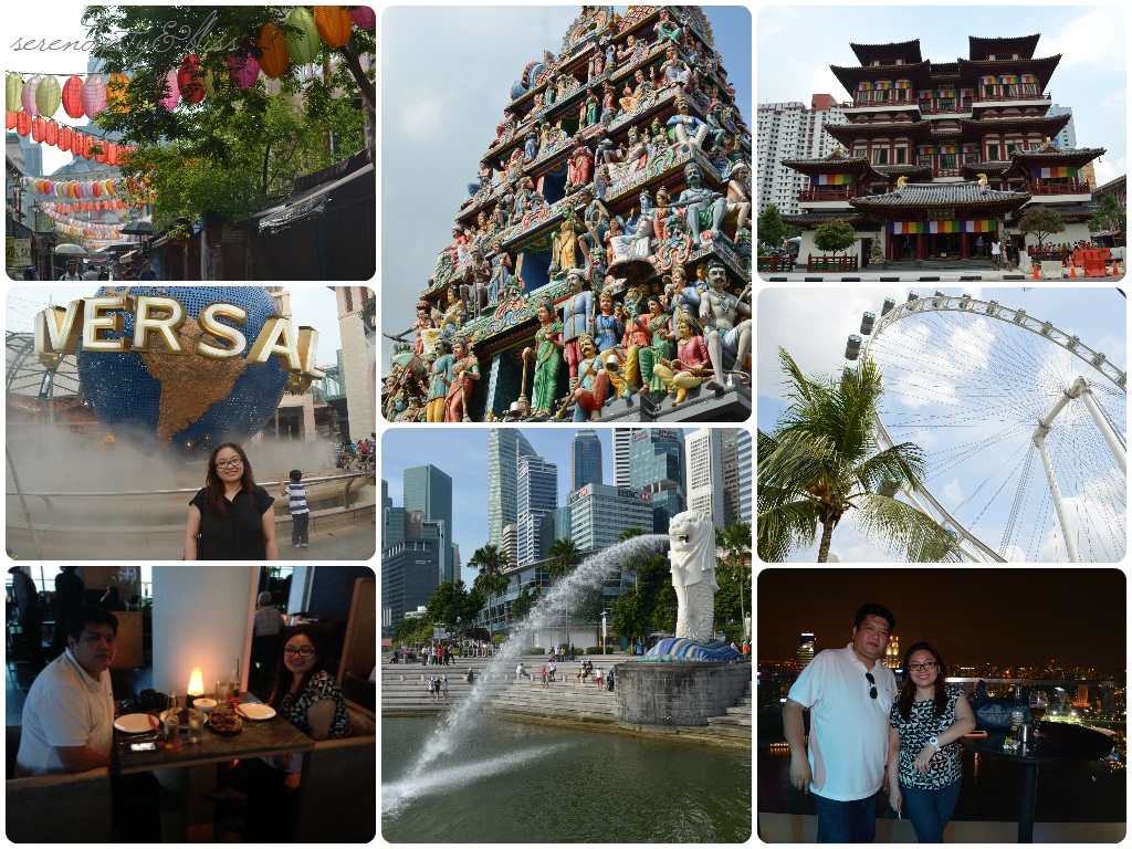 Clockwise L-R: Chinatown’s colorful lanterns; Sri Mariamman Temple; Buddha Tooth Relic Temple; Singapore Flyer; On top of Marina Bay Sands Singapore at night; Merlion Statue; Dinner at Ku De Ta in Marina Bay Sands; Universal Studios Singapore
