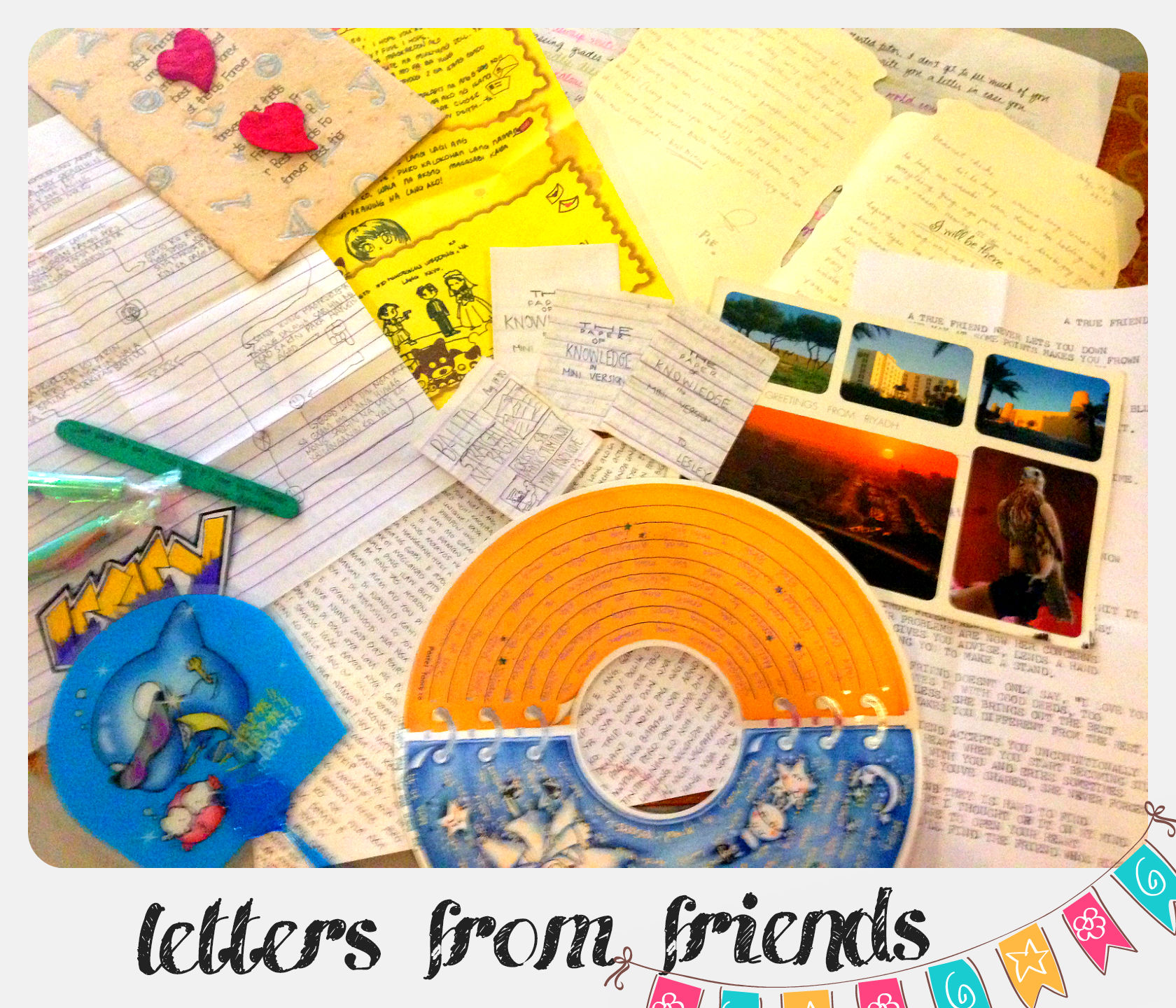 I can’t actually take a picture of EACH of the letters, but these ones I’ve set aside for some reason – they’re cute, there’s a special message or it’s just extremely ridiculous!  The post card’s from an old teacher that I kept in touch with after he went to work abroad. Letters written on candy-like stationary, at the back of a fan, self-made one-page “comic” books, a note on a popsicle stick, a typewritten (and I mean from a type writer) friendship poem, and so on.