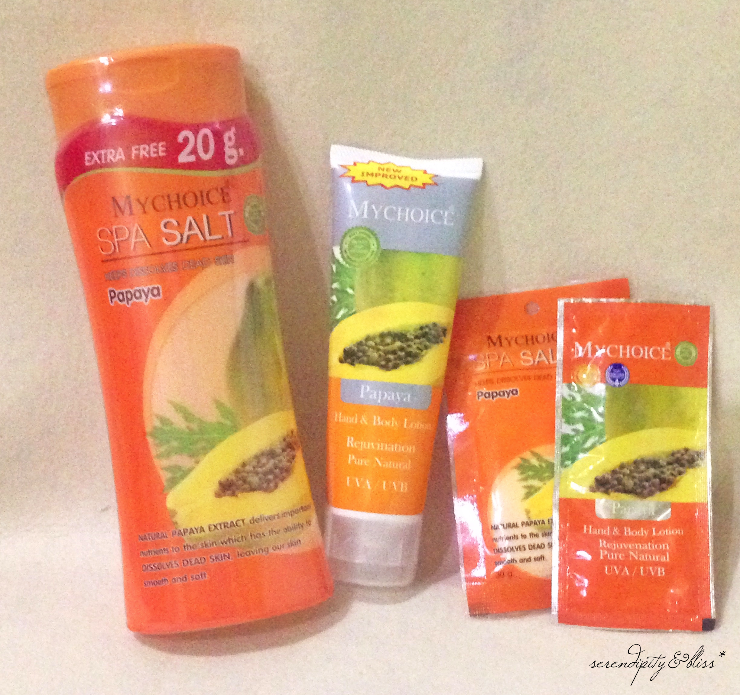 I love Papaya products. I use Papaya soap alternately with my regular Dove soap. This one is of different form: bath salt. I haven’t used bath salts before, but I might become a convert after trying this product out! My skin is really sensitive and easily reacts to products with strong scents and chemicals, so the lotion I might re-think to use.