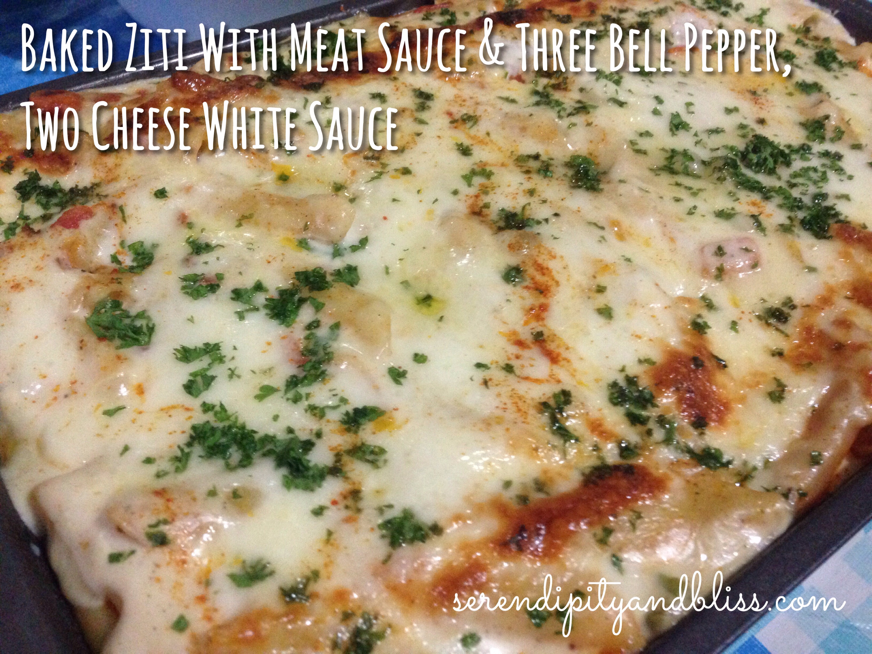 Baked Ziti with Meat Sauce & Three Bell Pepper, Two Cheese White Sauce
