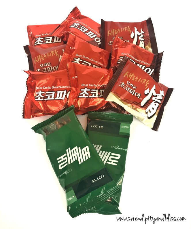 The red ones are Korean Lotte Choco Pies! I bought 2 boxes (bundled together) for only KRW 3,000.  I gave one box to my mom and half a box to my sister – they both love these!  The 3 odd ones from the pile are also choco pies, but I’m not sure what brand they are.  These are free stuff from the AirBnB house.  The green ones are Lotte Almond Pocky Sticks.  I bought the 4-pack box and gave 2 packs to my brother.  I can’t remember how much this costs though.