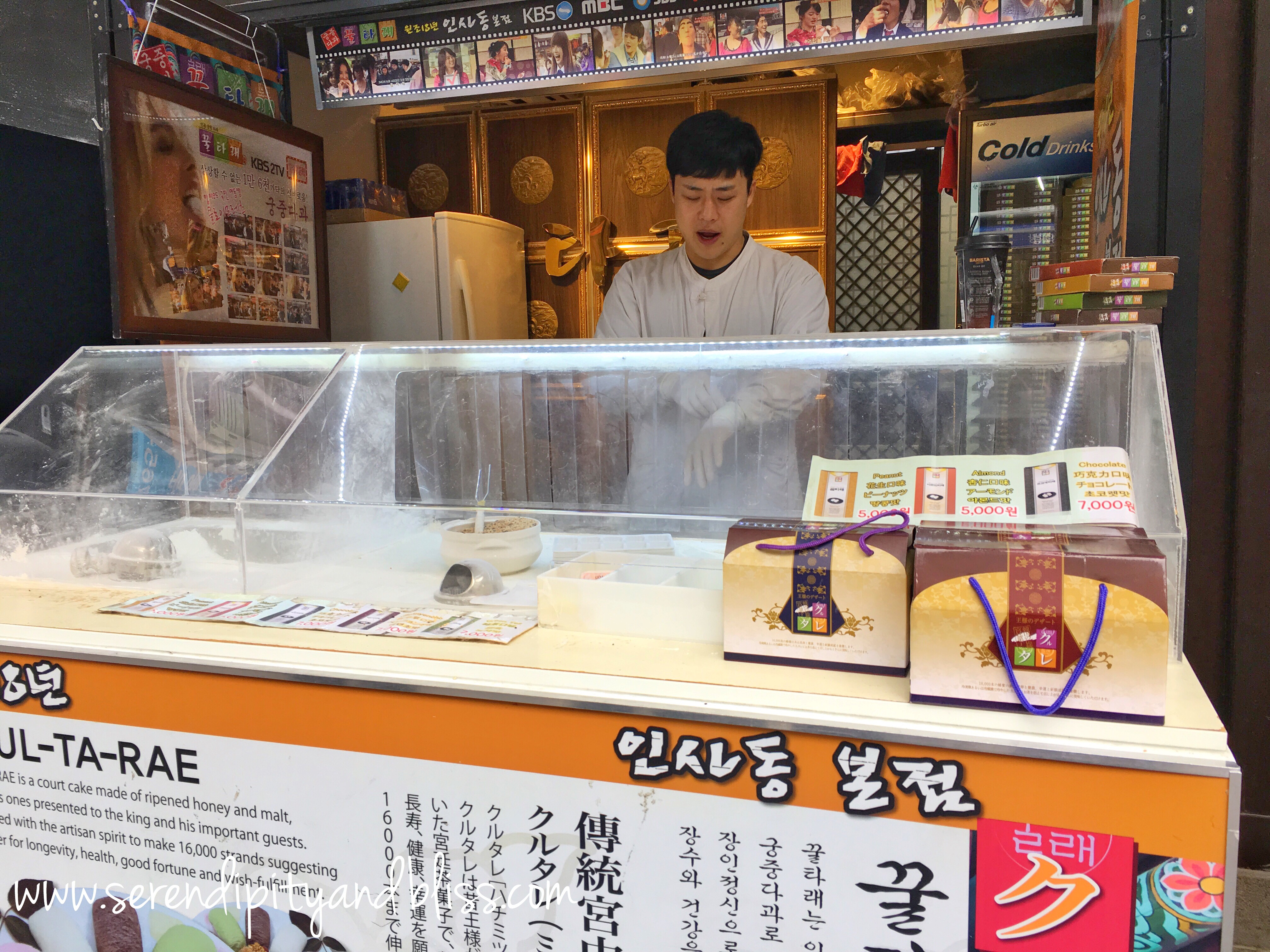 1. Hi jiawen! We bought the kultarae along insadong. There’s 2 stalls there, owned by the same person. They said it lasts for 6 months when refrigerated, 3 months if room temperature. The nuts were still okay after 2 months. But the “thread-like” part becomes a little chewy. Unlike when it has been made fresh, it’s very brittle and crunchy.