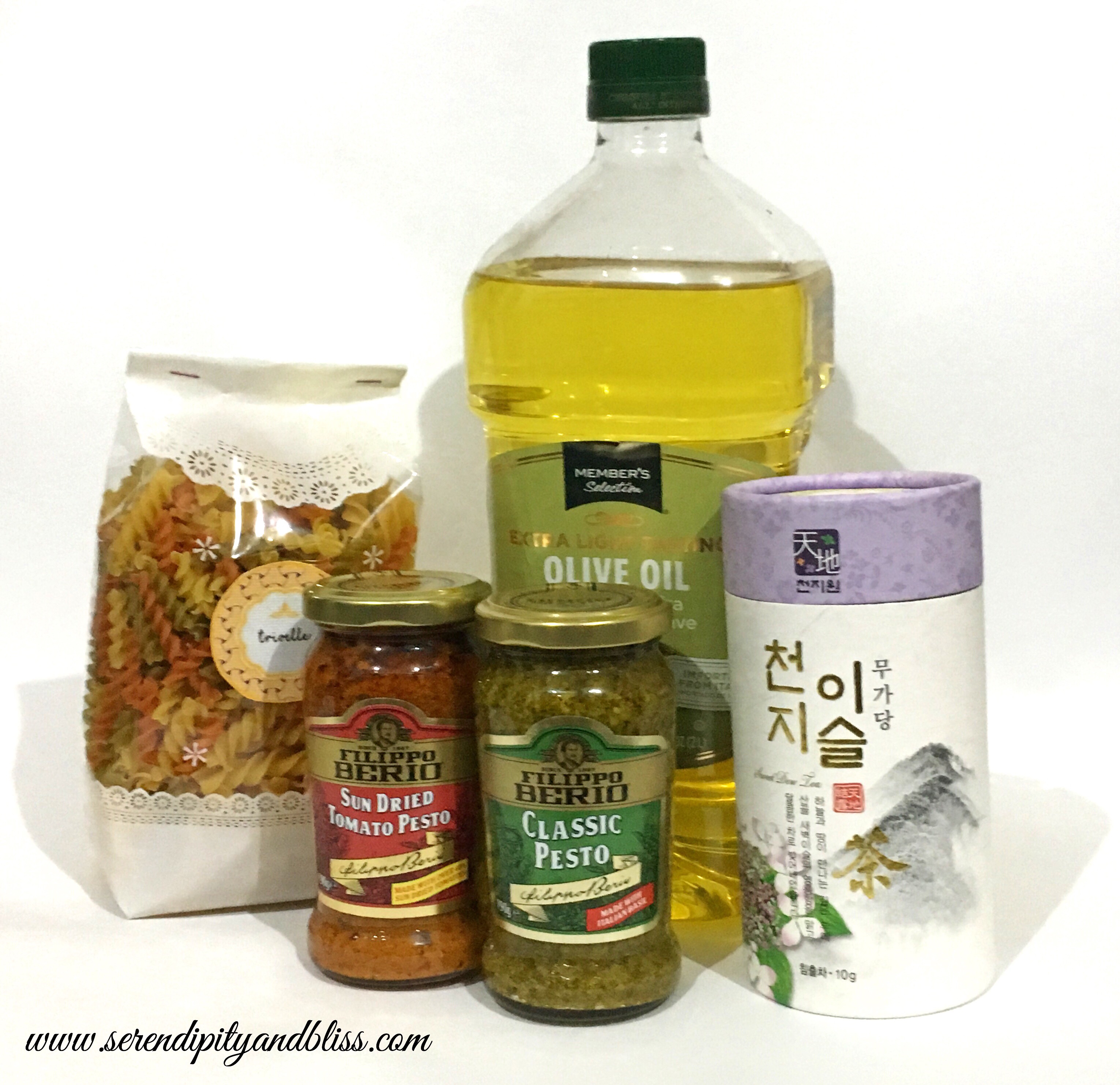 Food Products. I bought the pasta, pesto and sundried tomato pesto at the local grocery store; the EVOO at S&R; and the tea from our trip in Korea. NOTE: The EVOO I used is not the one in the photo, but it is of the same brand. I already transferred the contents to the bottles before this photo was taken. 🙂