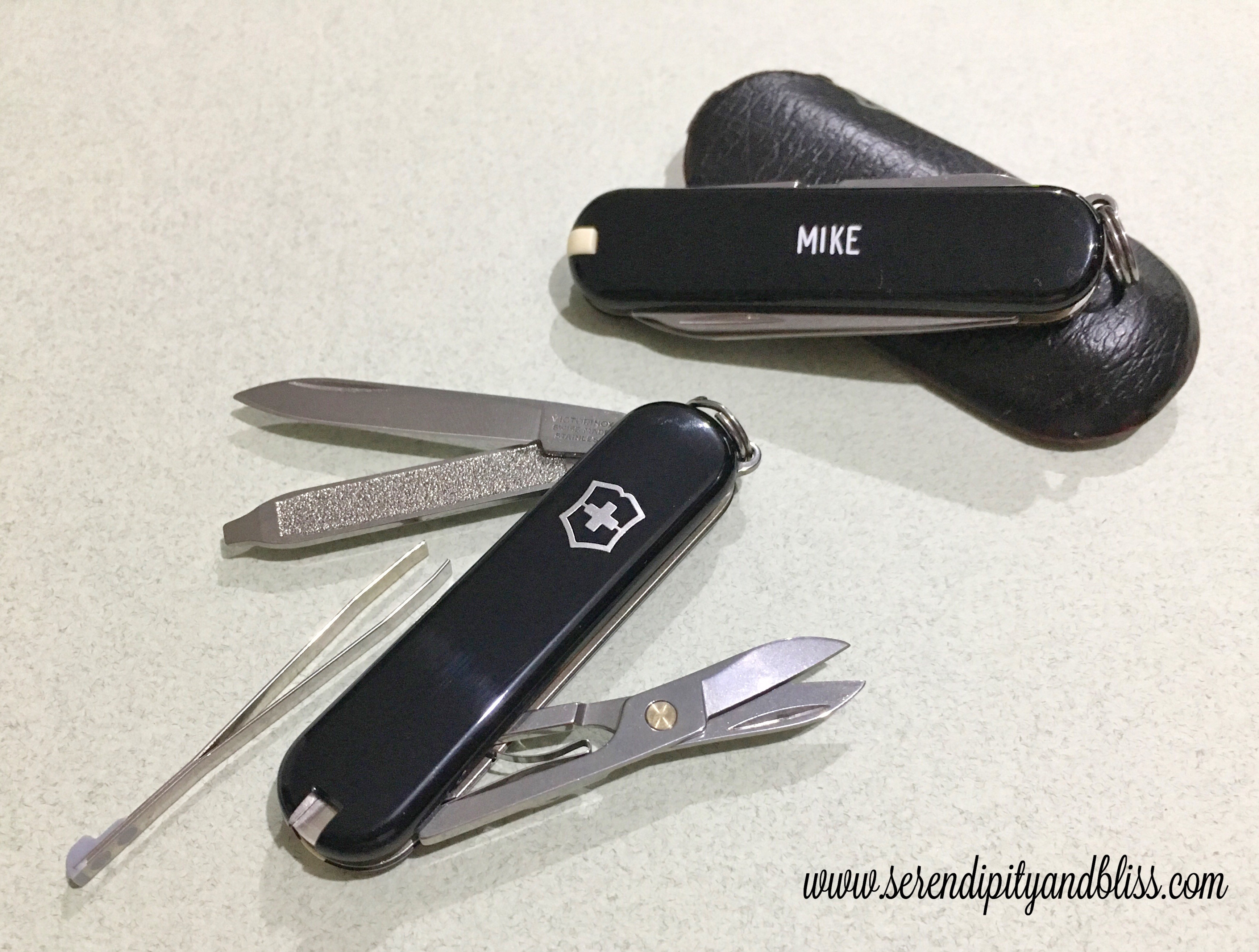 After contemplating for months, he decided to give swiss army knives to his entourage. We bought 6 Black Victorinox Classic Swiss Army Knives from Cutting Edge in Shangri-la Plaza Mall for Php 550 each with free name engraving.