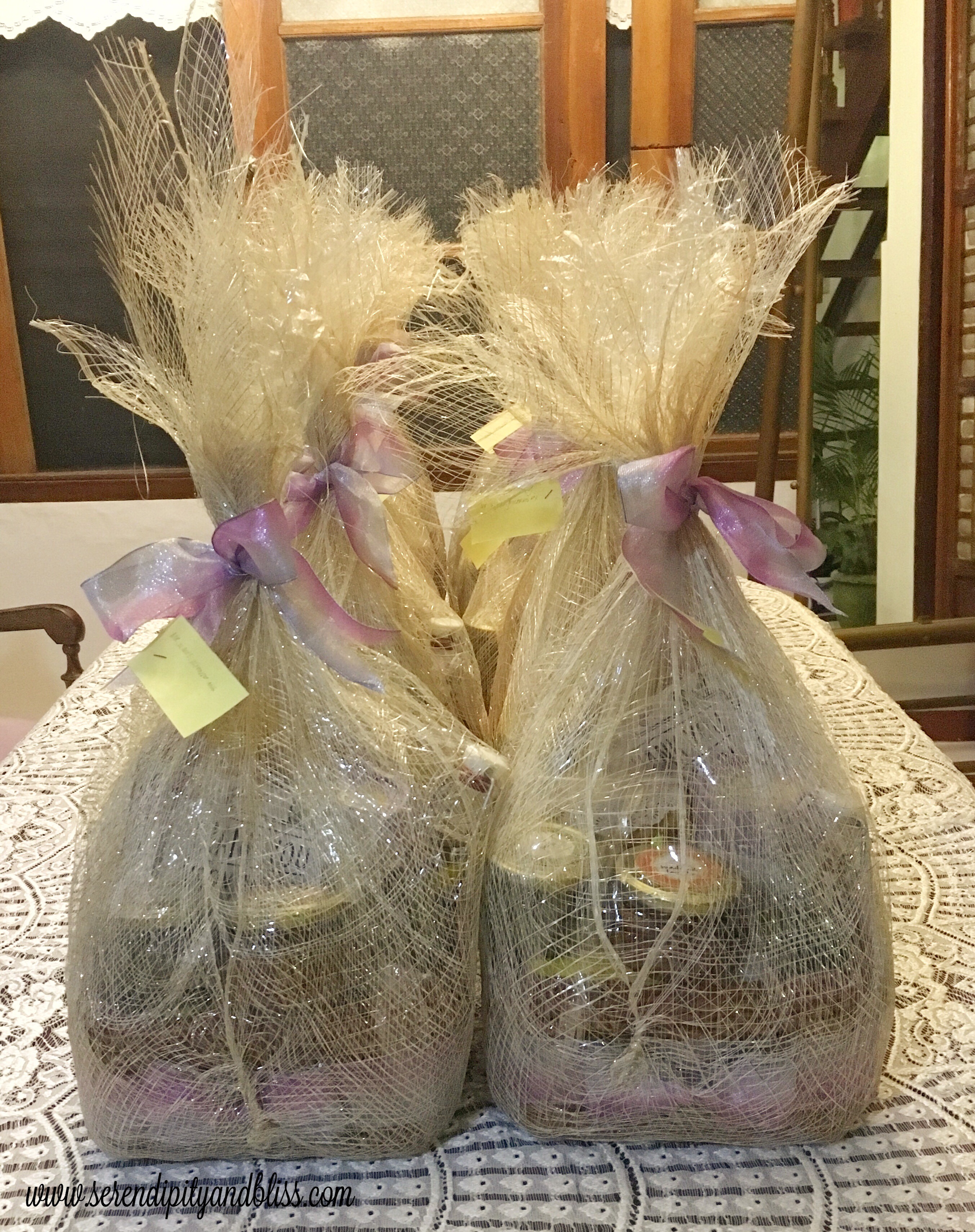 I got the idea of gift baskets when I saw a somewhat similar one from a bridal fair. The only thing is, buying from that supplier costs more than double the budget . So I decided to DIY it as usual! I bought different food products and re-packaged them to make the basket more cohesive. 🙂