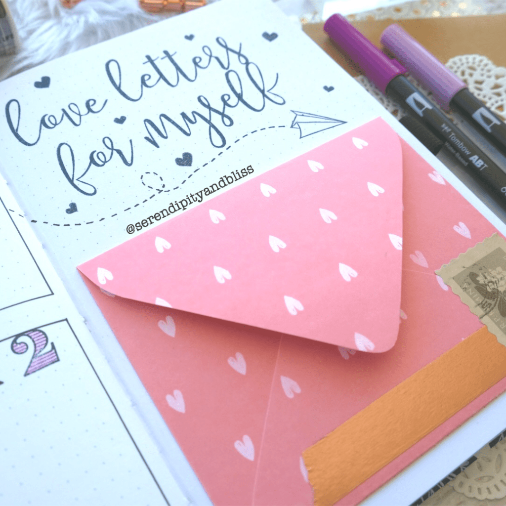 On the adjacent page, I decided to write love letters to myself. I made an envelope using a pink decorative paper with hearts then stamped in the title and a paper plane and little hearts. I will be writing snippets of my day, words of encouragement, quotes I liked, photos or anything really to be read in the future.