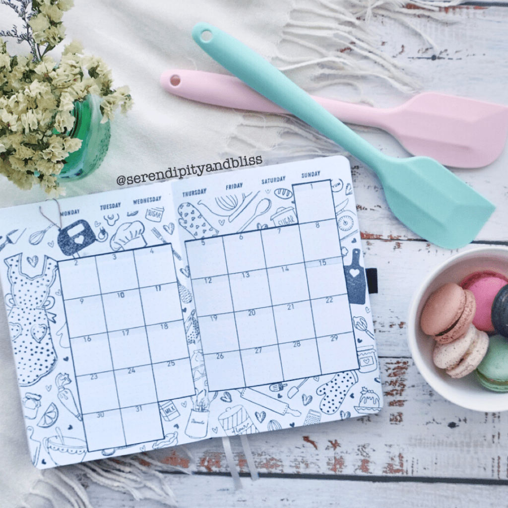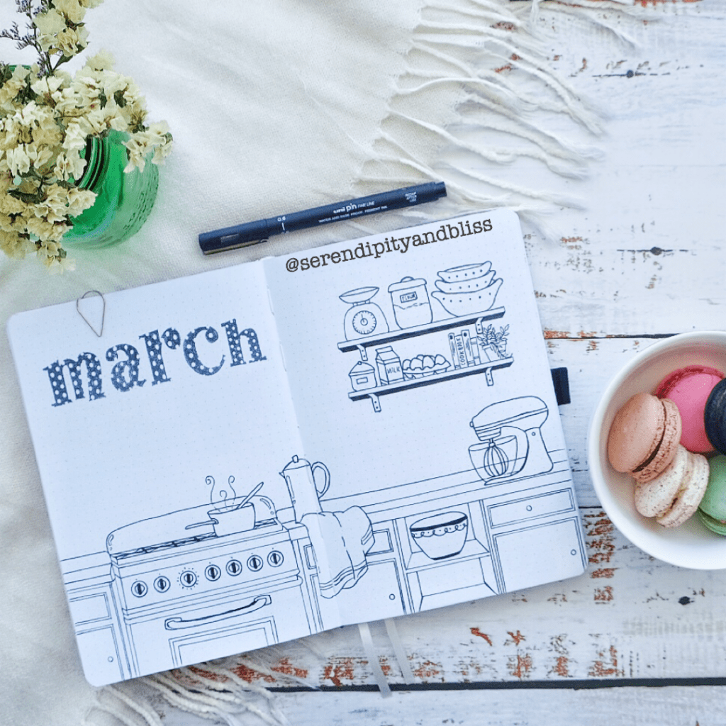 I drew a kitchen scene for the cover page. I took inspiration from a kitchen illustration I saw on Pinterest and then filled in the rest to complete the drawing. Then I stamped in the month name using a bold, polka-dotted clear stamp.