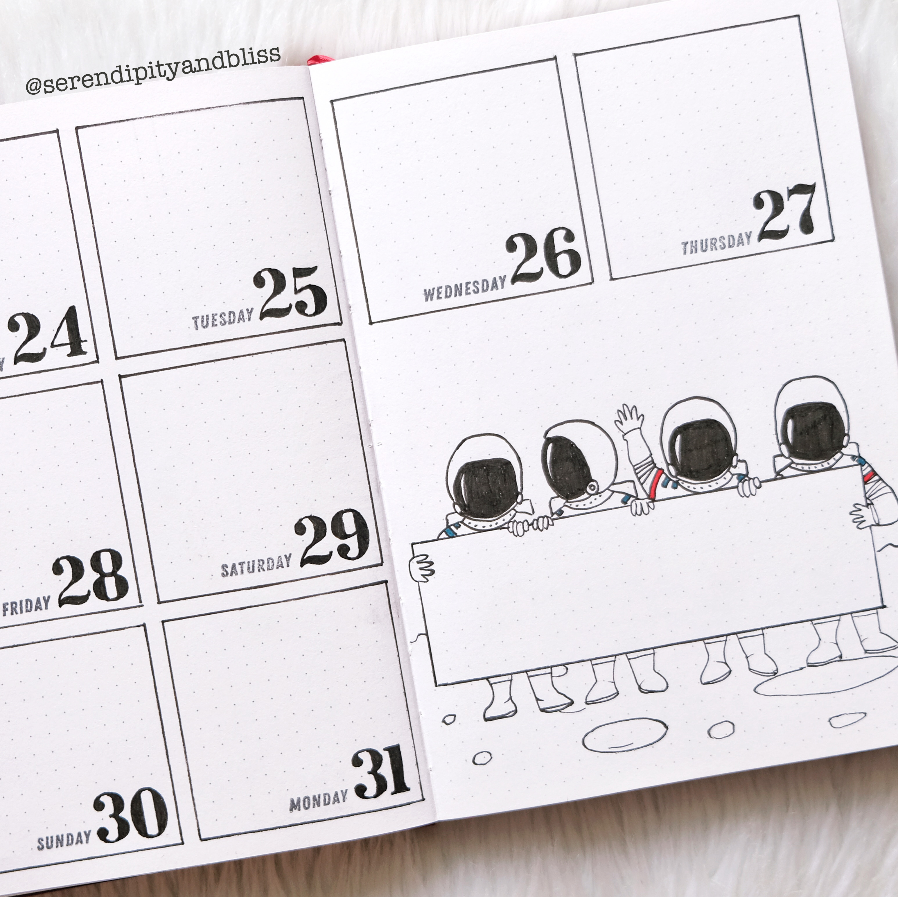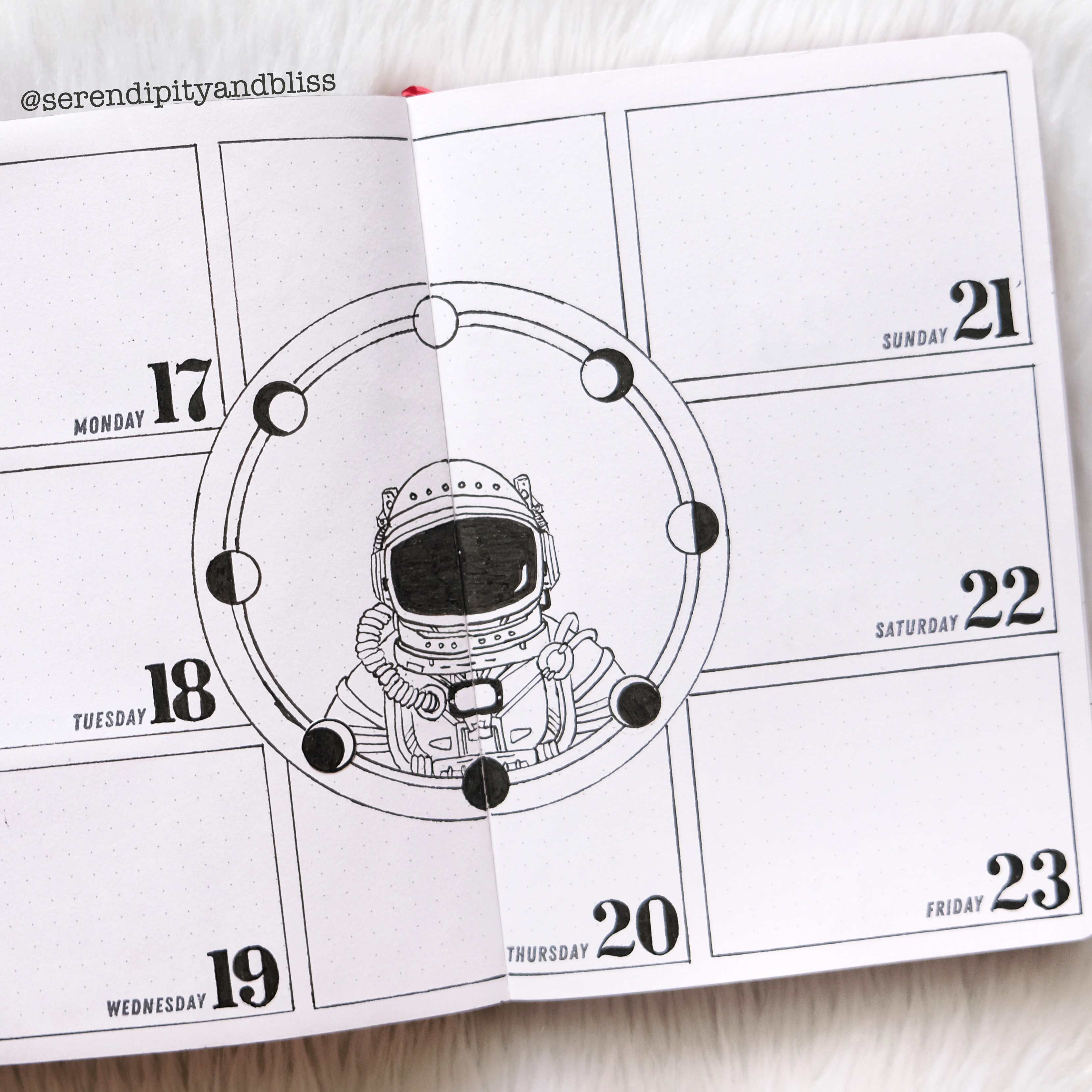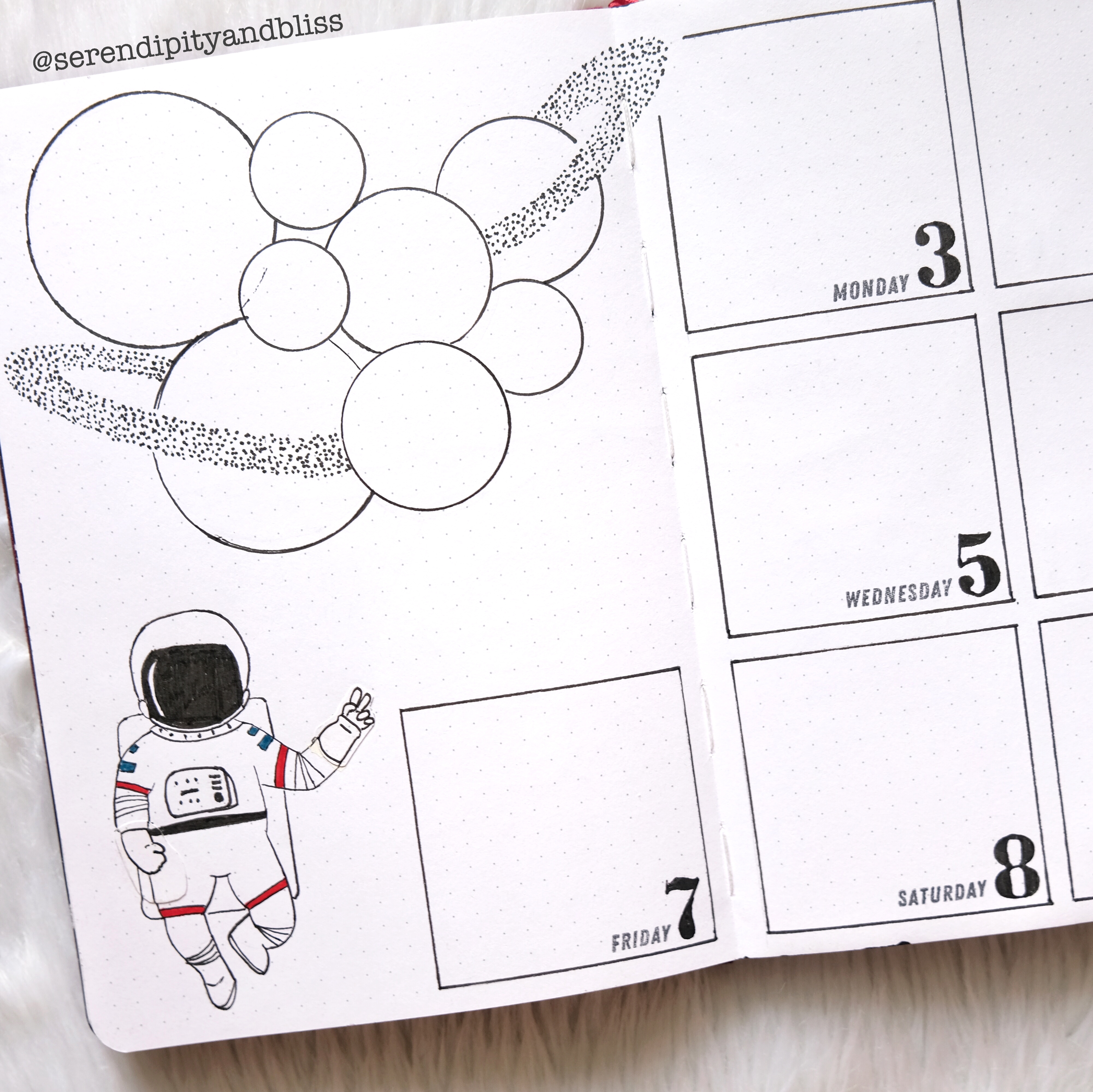 My calendar format has not changed all year. So this one is no different except for the astronaut on the side giving a peace sign! I also blacked out this page because I wasn’t too happy how it looked with a white background.