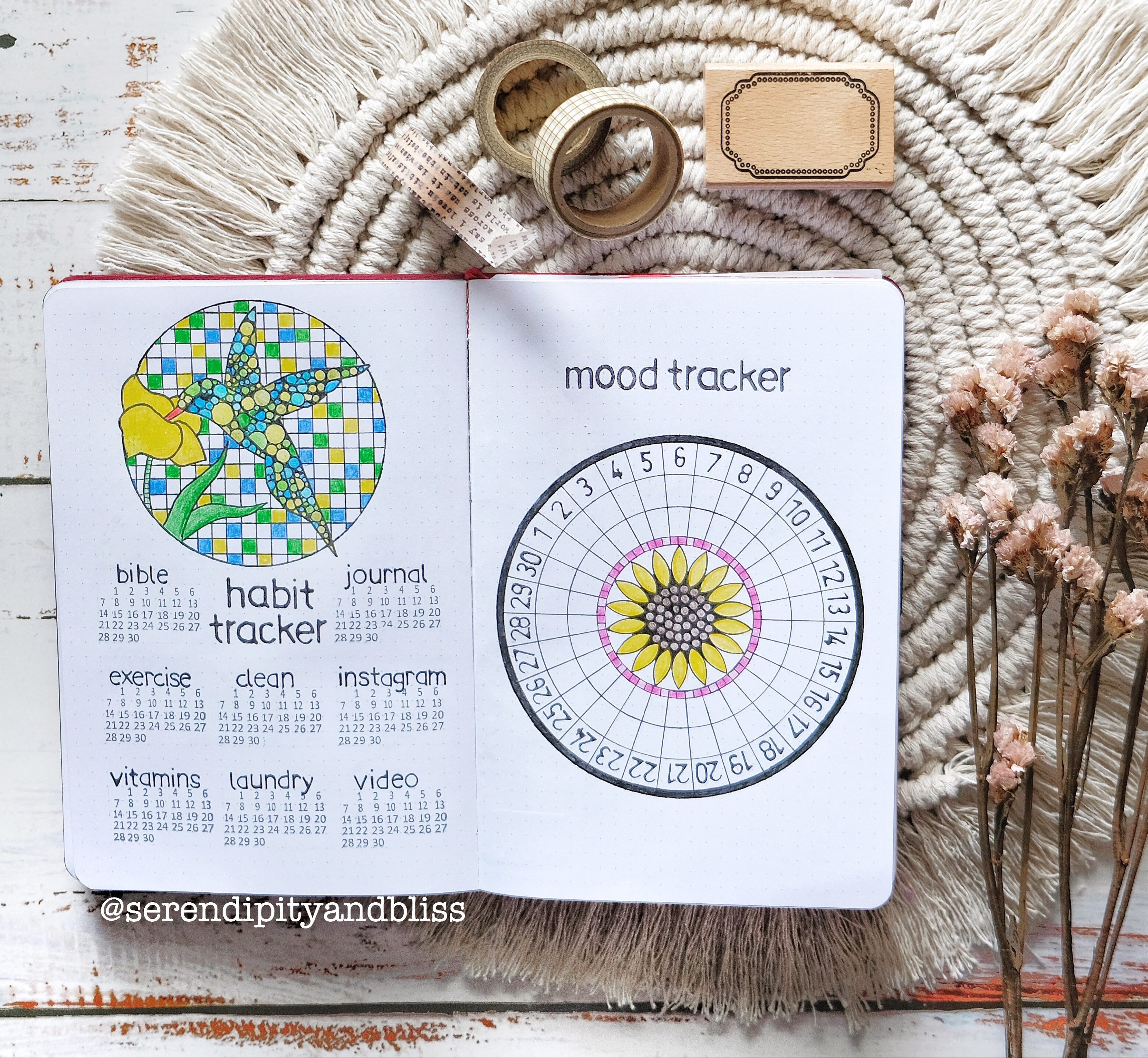 This month’s trackers are pretty much the same as the last couple of months except the theme changes. Again, I used different-sized stencils for the alphabets and numbers. And the repeating calendar is the only stamp I used this month. The habit tracker has a hummingbird pattern on it and a flower in the middle of the mood tracker.